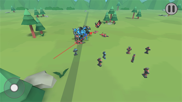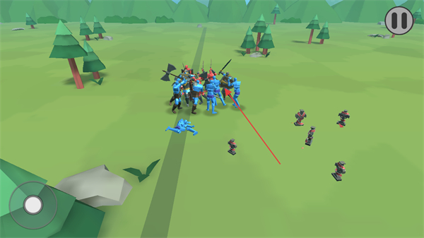 1、己方蓝色士兵击溃敌方红色士兵后,继续围攻剩余黑色士兵,推进战斗。