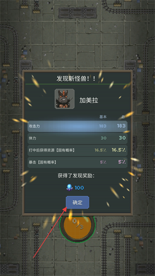 1、发现新怪兽加美拉后,点击确定领取发现奖励,获得资源。