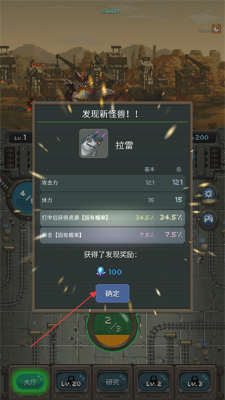 3、发现新怪兽拉雷后,点击确定领取发现奖励,获得资源。