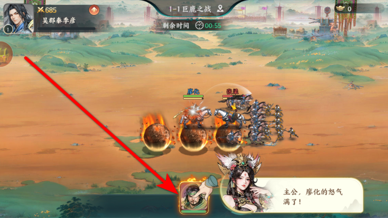 3、战斗时,当将领怒气值满了,点击下方将领头像,就能释放强力技能,对敌人造成大量伤害,助力取得战斗优势。