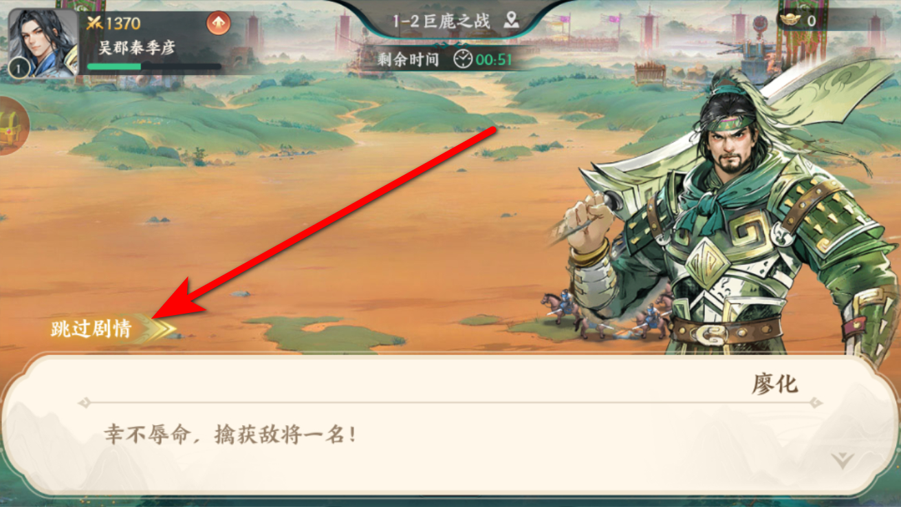 4、战斗结束后若有剧情,同样可以点击跳过剧情,快速知晓战斗结果,然后继续挑战下一场战役,推进游戏进程。