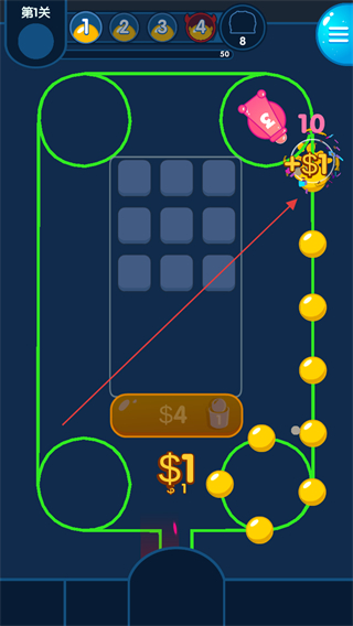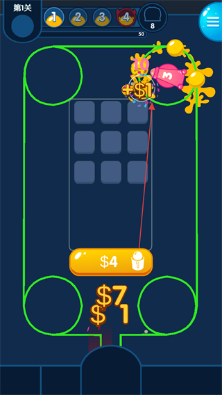 4、持续拦截彩弹敌人,积累$7资金,升级防御,阻止敌人抵达终点。