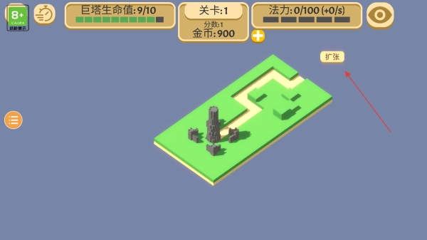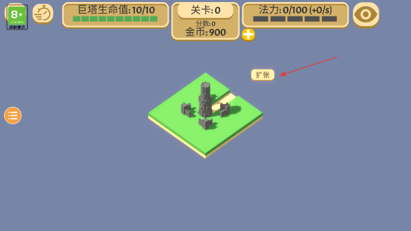 2、点击“扩张”选项,让巨塔所在的区域逐渐扩大,随着扩张进行,关卡会提升,同时要留意巨塔生命值的变化,确保扩张过程中巨塔状态稳定。
