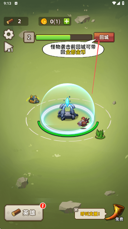 3、留意游戏提示,在怪物袭击前回城可带回全部金币,及时回城保存资源。