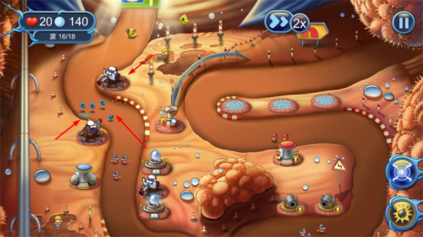 2、敌人波次来袭时,利用防御塔的攻击效果如爆炸、电攻,对敌人造成大量伤害。