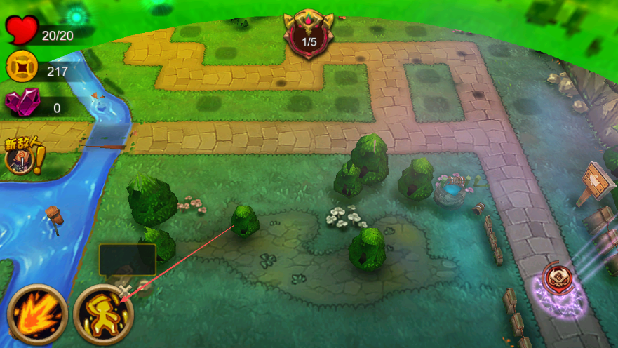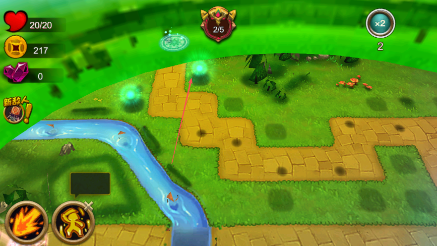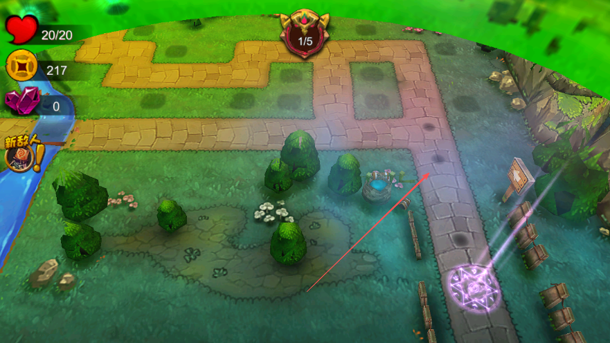 2、放置好防御塔后,留意敌人行进路线,如箭头所示,确保防御塔能攻击到敌人。