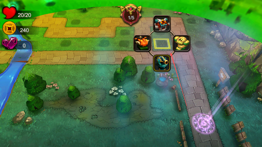 1、进入游戏,查看左上角生命值20/20、金币240等资源,点击箭头所指位置放置防御塔。