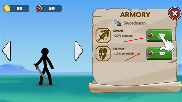 4、在军械库升级士兵装备如剑、头盔,提升士兵战力,应对更强敌人。