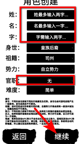 2、在角色创建页,按要求填写姓名字,选好信息点继续。