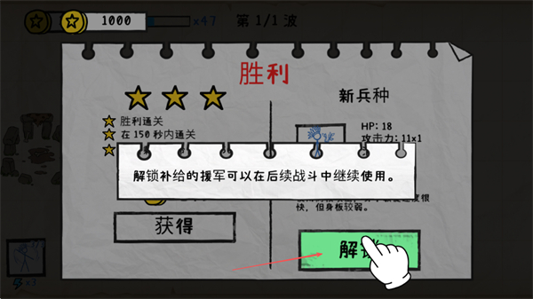 4、战斗胜利后,点击解锁按钮,开启新兵种,后续战斗可继续使用解锁的援军。