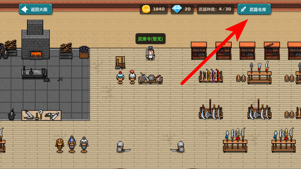 2、在大殿中点击武库令对应的职位区域,进入武库功能界面,这是管理武器装备的核心入口,后续的装备打造、资源管理等战力提升相关操作,都需通过该界面推进。