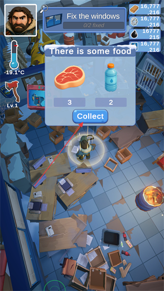 2、寻找地图中发光的装备,点击Collect进行获取装备,如拾取背包可以获得肉和水资源,拾取斧头可以用于砍伐物资等等。