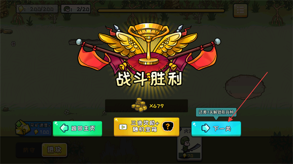 4、击败敌方所有单位并摧毁敌方建筑后,战斗胜利,点击下一关继续挑战。
