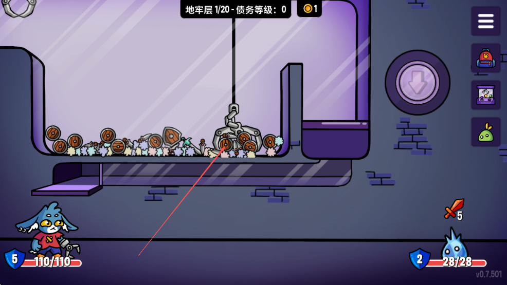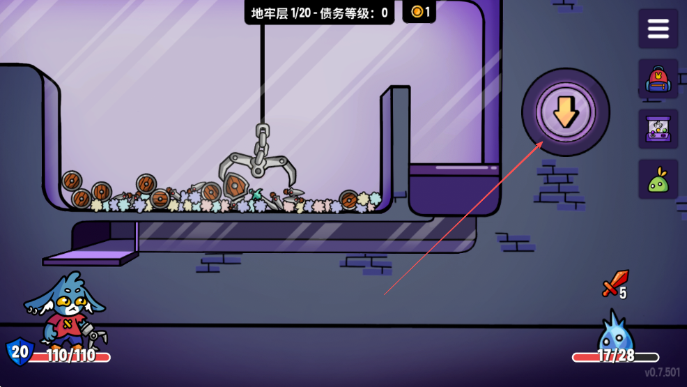 1、进入游戏,查看当前所在的地牢层数如箭头所指地牢层1/20和债务等级。