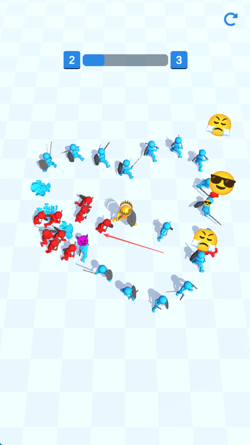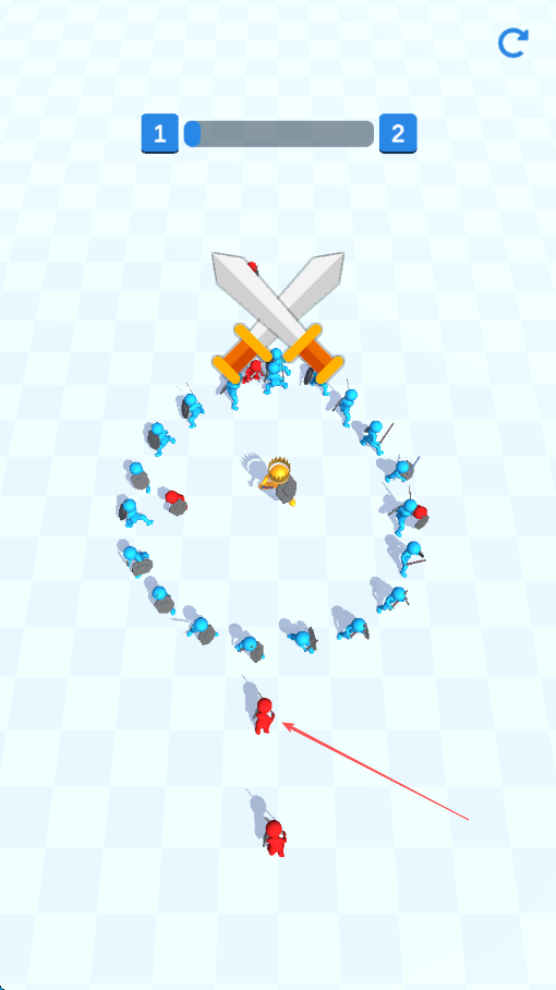 1、游戏开始,观察进度条,按箭头方向操控红色士兵靠近被蓝色士兵包围的金色将军。