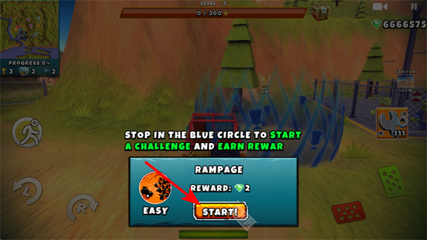 1、在游戏中,停在蓝色圆圈内点击START开启挑战,挑战参与是获取奖励的关键操作,可参与RAMPAGE等任务。