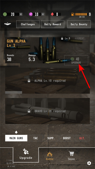 3、在武器升级界面点击UPGRADE按钮,这是强化武器性能的核心操作,消耗资源后可提升武器的伤害或属性,战场中的作战效率。