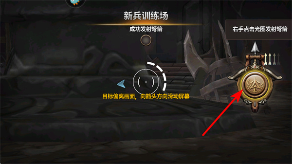 4、点击发射按钮射出弓箭,同时根据提示滑动屏幕调整视角,这是精准重要操作,调整后能提升射击的准确性,完成训练任务要求。
