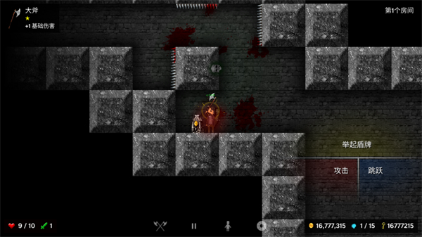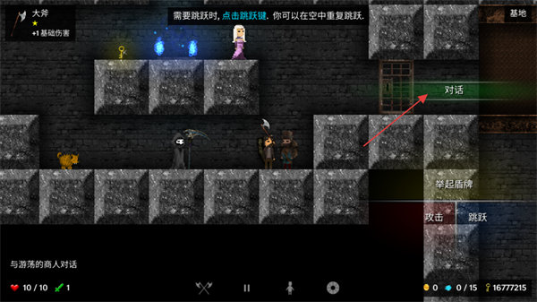 1、此场景中点击对话按钮可与游荡的商人交互,同时可通过跳跃键支持空中重复跳跃移动角色,搭配大斧作战,推进与商人的互动流程。