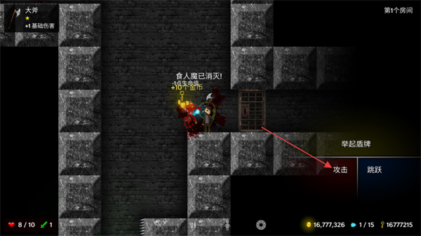 4、战斗过程中点击攻击按钮操控角色攻击敌人,击败食人魔后可获得生命值、金币等奖励,积累资源的同时推进关卡流程。