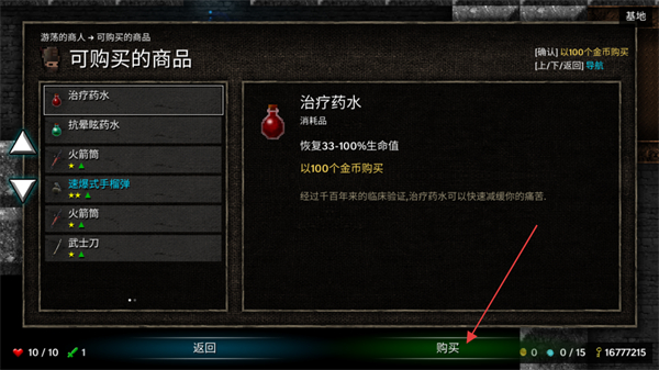 3、在商人的商品界面中,选定目标商品如治疗药水后,点击购买按钮消耗对应金币获取该物品,以此提升角色的生存或战斗能力。