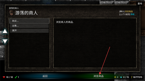 2、进入与游荡商人的交互界面后,通过导航键选择功能选项,点击浏览商品按钮可查看商人提供的物品,开启交易相关的操作流程。