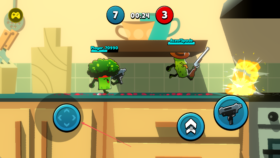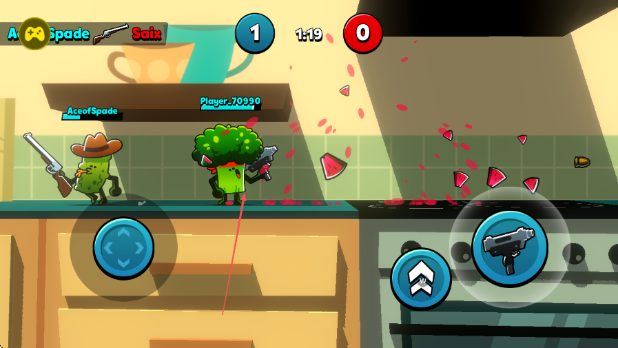 2、遇到敌人如西瓜角色时,点击右下角枪械按钮开枪攻击对手。