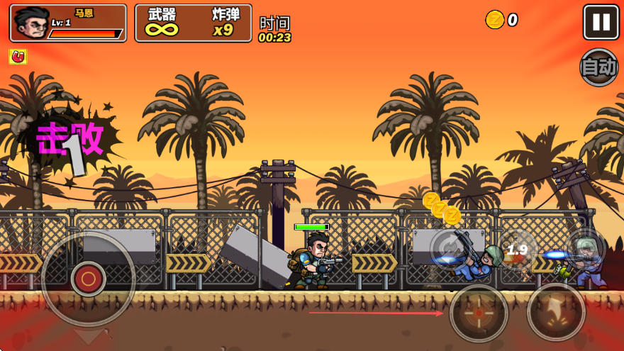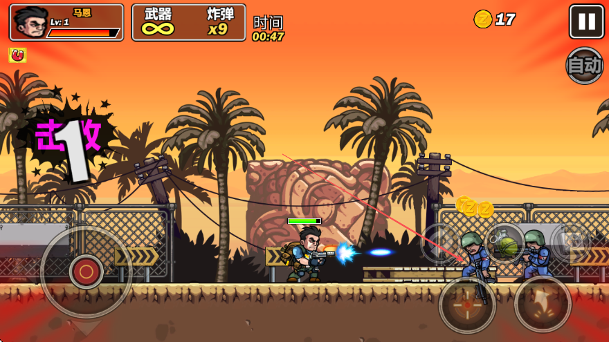 1、关卡战斗操作:进入关卡后,通过虚拟摇杆控制角色移动,点击射击按钮瞄准敌人开火,根据敌人数量调整攻击策略,优先消灭威胁较大的目标。