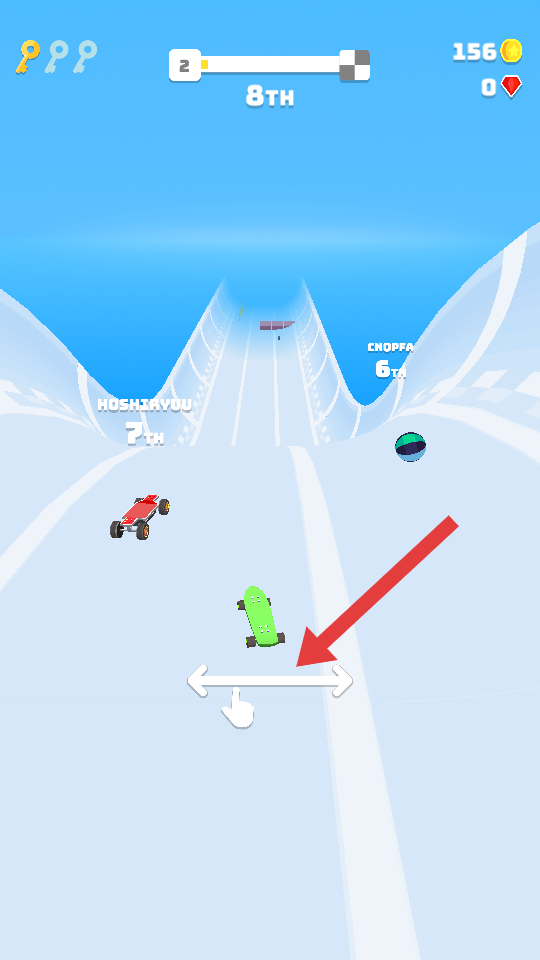 2、进入多人竞速赛道后,通过箭头指向的左右滑动区域,灵活调整滑板的左右位置,躲避其他竞速单位,找准时机超越对手。