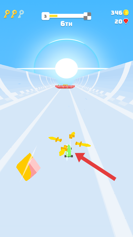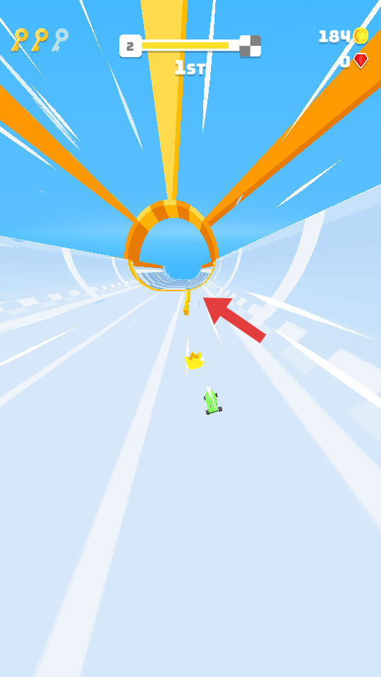 3、遇到赛道上的黄色圆环时,操控滑板朝着箭头指向的圆环方向滑行,穿过圆环可获得加速或其他增益效果,提升竞速排名。