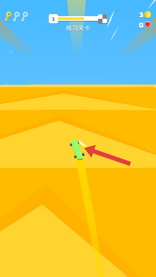 1、在练习关卡中,操控箭头指向的滑板,沿着黄色路径滑行,熟悉滑板的移动手感与游戏基本操作,为后续竞速做好准备。