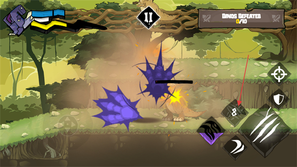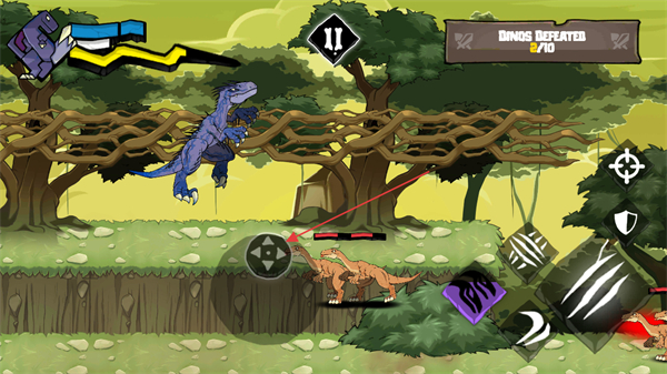 3、通过底部控制按钮操作己方恐龙移动,向上滑动方向键可以控制恐龙进行跳跃,躲避敌方的攻击同时为后续攻击或技能释放创造条件。