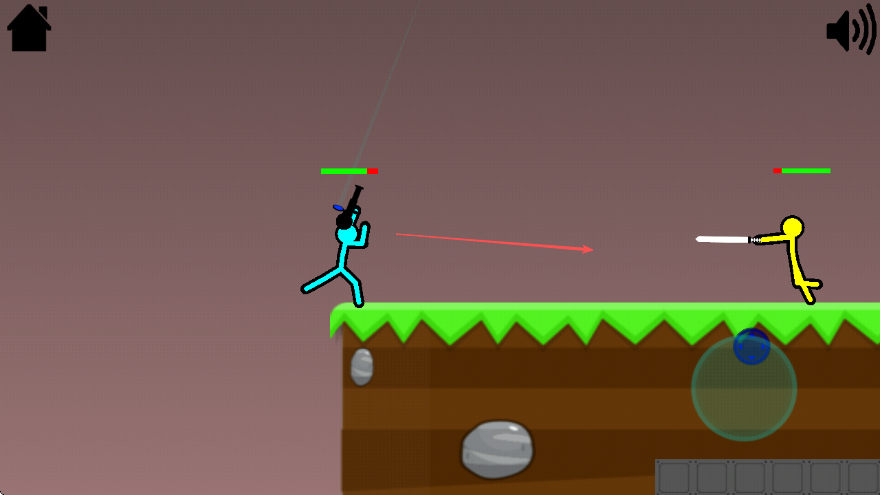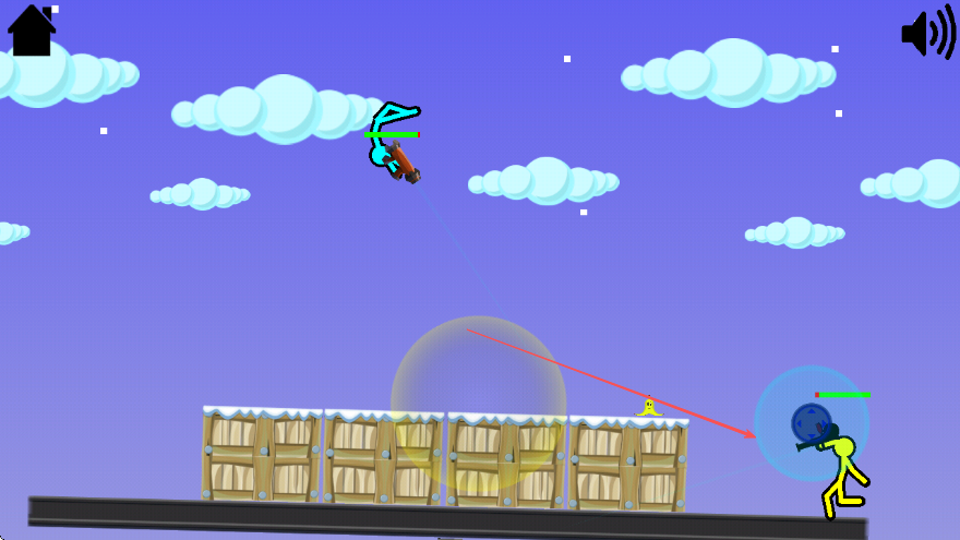 3、当蓝色火柴人获取枪械道具后点击攻击键远程射击黄色火柴人、注意躲避反击。
