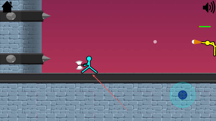 1、进入游戏通过虚拟摇杆操控蓝色火柴人移动靠近黄色火柴人、利用斧头发动攻击。