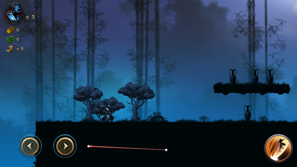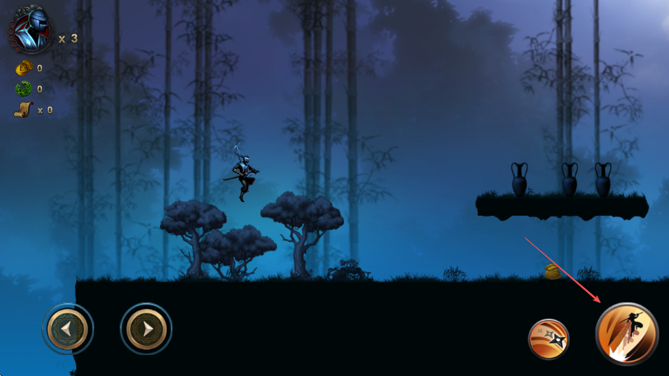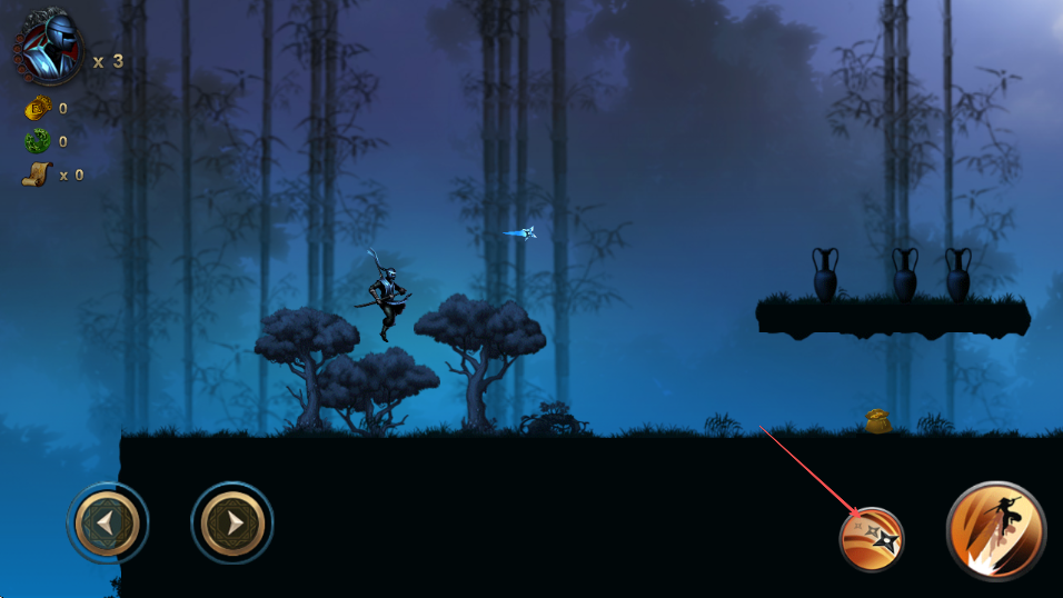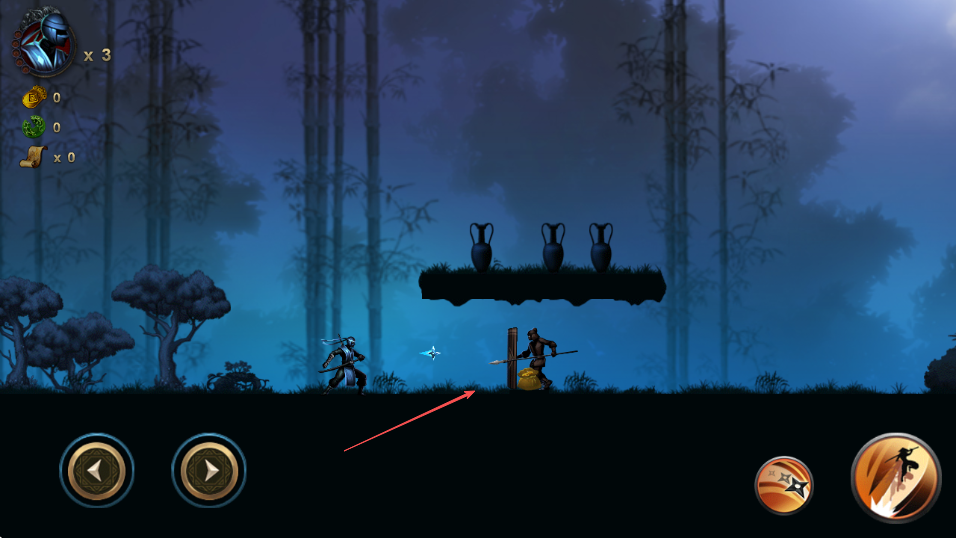 2、通过左下角方向按钮操控忍者武士移动,遇到空中敌人时,点击跳跃躲避攻击。