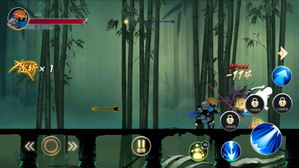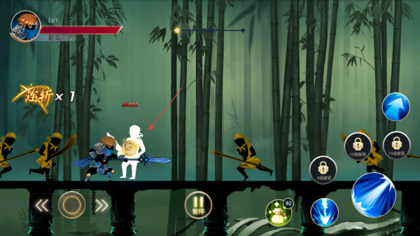 1、操控赵云进入竹林关卡,留意自身Lv1等级和血量条,利用普攻按钮攻击前方白色敌人。