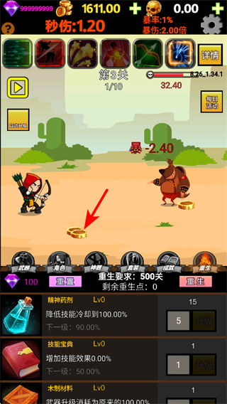 1、在游戏中,持续攻击敌方怪物,攻击操作是积累金币的关键操作,持续攻击可快速获取金币,用于武器升级、强化等资源消耗。
