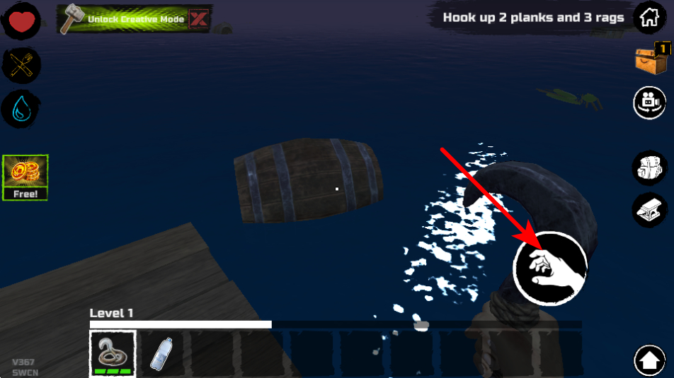1、进入页面点击界面右侧的手型图标,可互动拾取海上的木桶,获取桶内的资源道具。