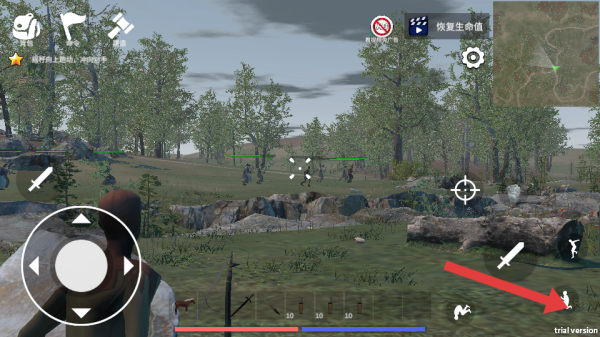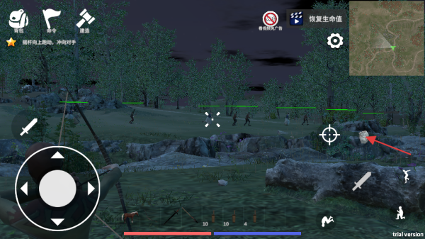 3、看到箭头指向隐蔽按键时,需要埋伏起来观察有无接近的敌人,在与未知的敌人保持安全距离时,查看己方人数。
