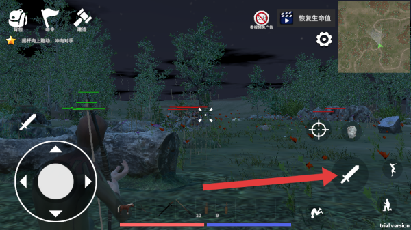 4、在近战战斗中,点击箭头指向的剑图标,使用剑进行攻击,并点击瞄准按钮,发挥剑的近战的优势,消灭靠近的敌人。