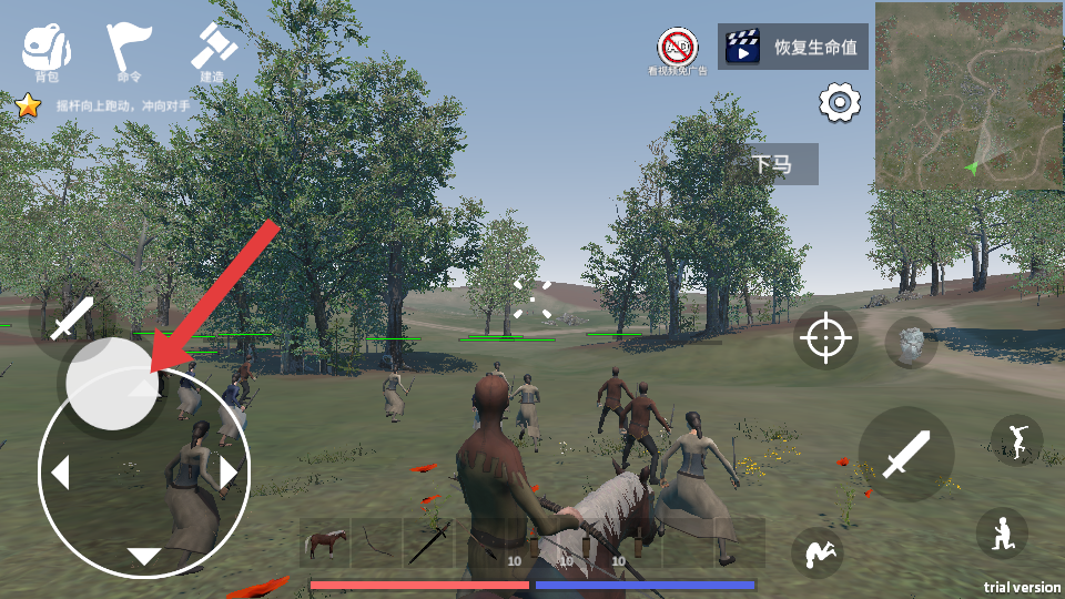 1、在骑马战斗场景中,操控箭头指向的移动摇杆,调整骑马方向,利用马匹的冲击力,近战攻击创造有利条件。
