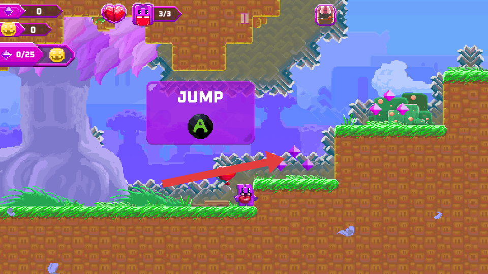 1、遇到有尖刺等障碍的地形时,按下提示的A键,操控角色跳跃,跨越障碍,避免受到敌人的伤害。