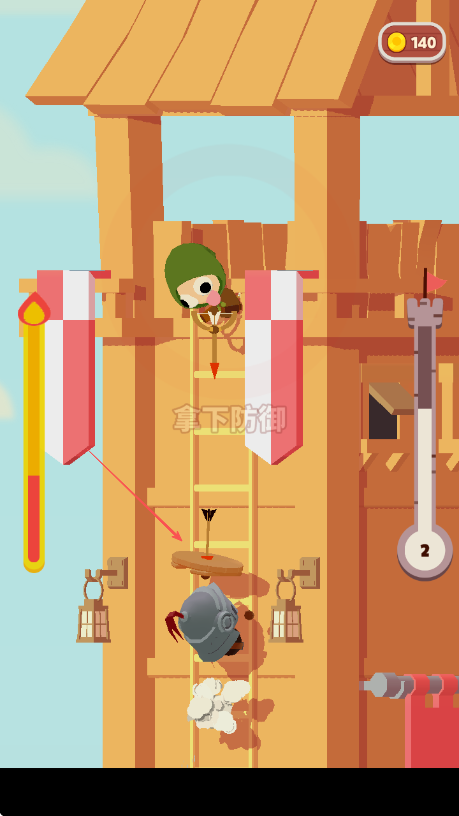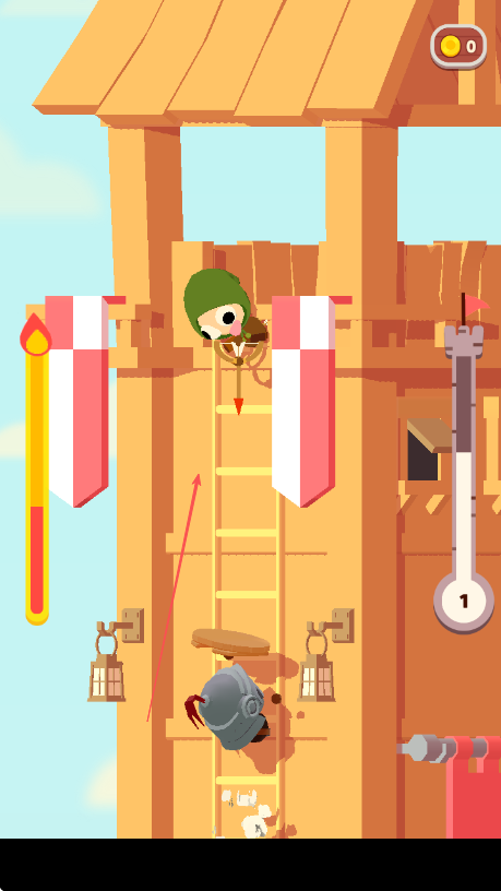 1、操控盾牌骑士靠近梯子,向上攀爬躲避上方敌人攻击。