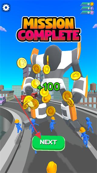 4、击败敌方机甲即为关卡胜利,可以获得金币奖励,点击下方NEXT按钮可以进入下一关。