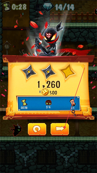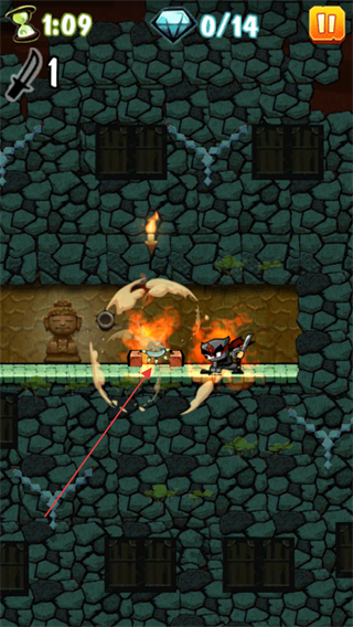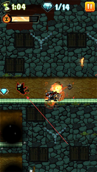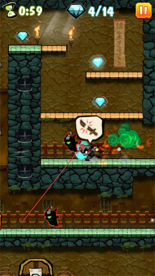 1、操控忍者躲避火焰陷阱,收集场景中的钻石,当前目标为收集14颗钻石,注意计时。
