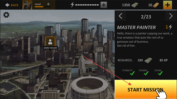 3、成长路径清晰,可选择擅长的任务类型积累经验与金钱,逐步解锁高级狙击装备与伙伴,感受从新手到顶尖杀手的进阶乐趣。