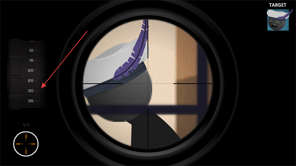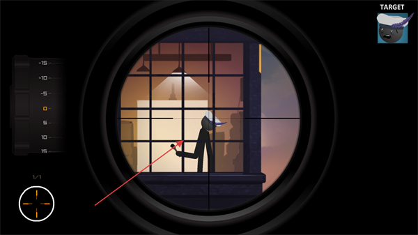 2、通过狙击镜瞄准目标火柴人,调整视角锁定目标,准备发起攻击。