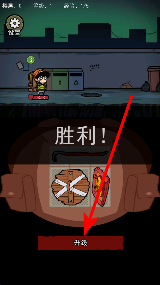 4、成功击败敌人后,会出现胜利提示,此时点击升级按钮,可提升背包空间,增加背包空间使放下更多的道具,为后续更艰难的冒险做准备。