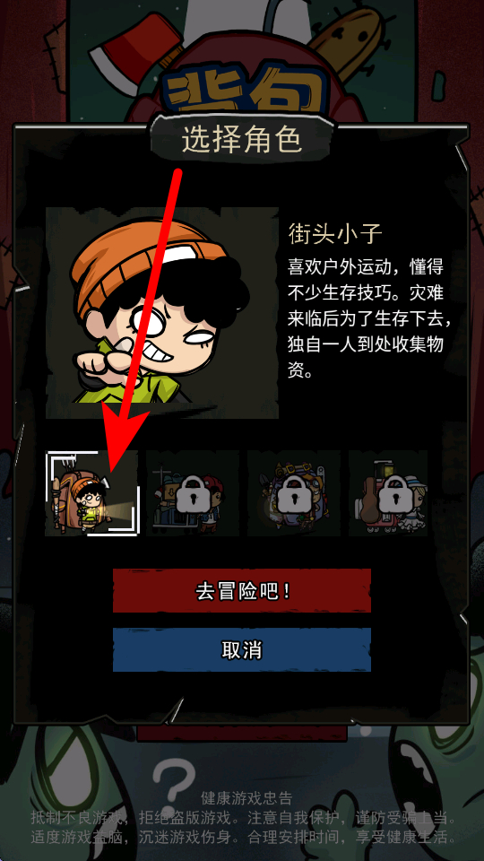 1、进入后,在角色选择界面,可挑选初始角色,不同角色有不同特点,选好后点击去冒险吧,开启冒险之旅。