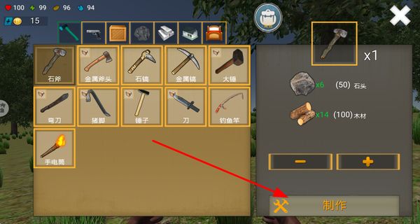 2、收集石头和木材等资源,在制作界面制作石斧,获取工具,助力荒野中的资源采集和生存。
